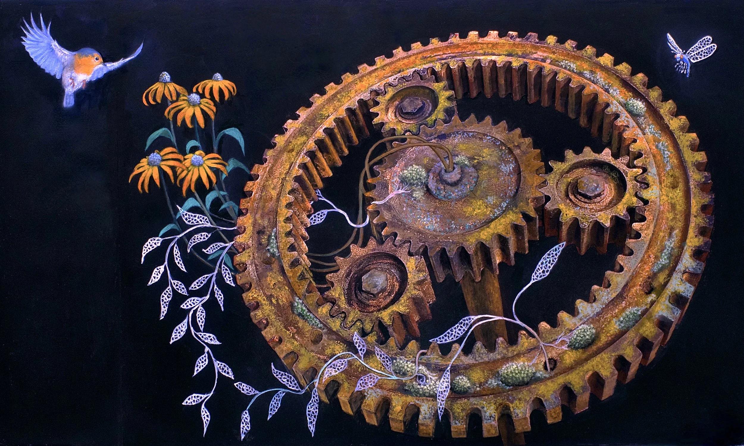 From the bergman film “The 7th Seal” that made an impact on me when in my teens. The struggle between light and darkness, life and death and the meaning of life were questions asked my self then. In the painting I put myself in crusader Antonius Block’s place and made death faceless. The Eurasian Goldfinch symbolises life and resurrection. Bergman and one of his “daemons” are hiding in the rock and Yukio Mishimas Death Poem in the dark clouds barely visible.